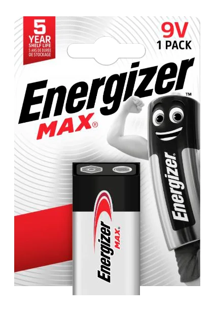 De Energizer Max 9V is een betrouwbare alkaline blokbatterij van het meest verkochte batterijmerk ter wereld. Met een houdbaarheid van 10 jaar en een capaciteit van circa 550 mAh levert deze batterij stabiele spanning voor een breed scala aan toepassingen — van rookmelders en multimeters tot gitaareffecten en speelgoed. Dit is een niet-oplaadbare alkaline batterij voor eenmalig gebruik.