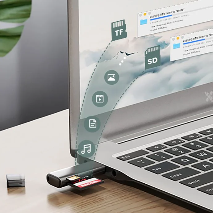 - Dual Slot Functionaliteit: De lezer beschikt over twee slots (SD en MicroSD) die gelijktijdig gebruikt kunnen worden. Dit maakt het kopiëren van data tussen twee kaarten zeer eenvoudig.