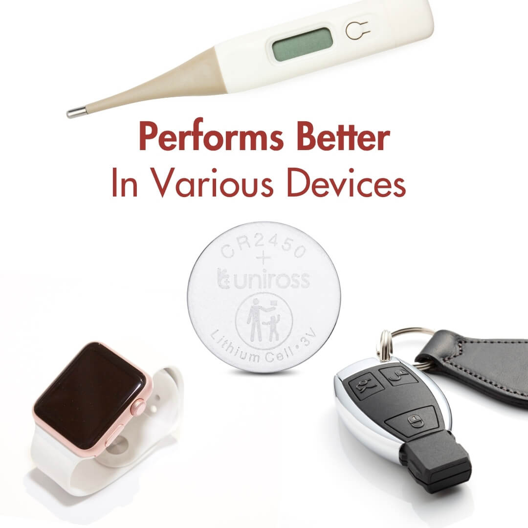 De CR2450 is een van de grootste lithium knoopcelformaten en wordt gebruikt in apparaten die meer stroom nodig hebben dan kleinere knoopceltypen kunnen leveren: